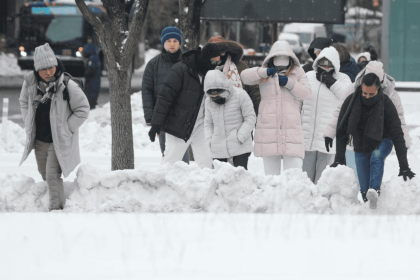 Los peatones trepan por los bancos de nieve para intentar cruzar las calles de Nueva York, el lunes 26 de…