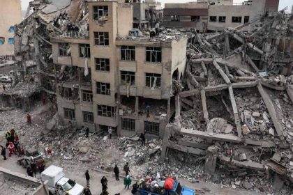 Los trabajadores de rescate se reúnen fuera de un edificio residencial dañado por ataques de Israel y Estados Unidos en…