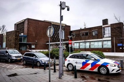 Un coche patrulla está estacionado frente a una sinagoga, que fue blanco de un ataque incendiario, en la plaza A.B.N.…