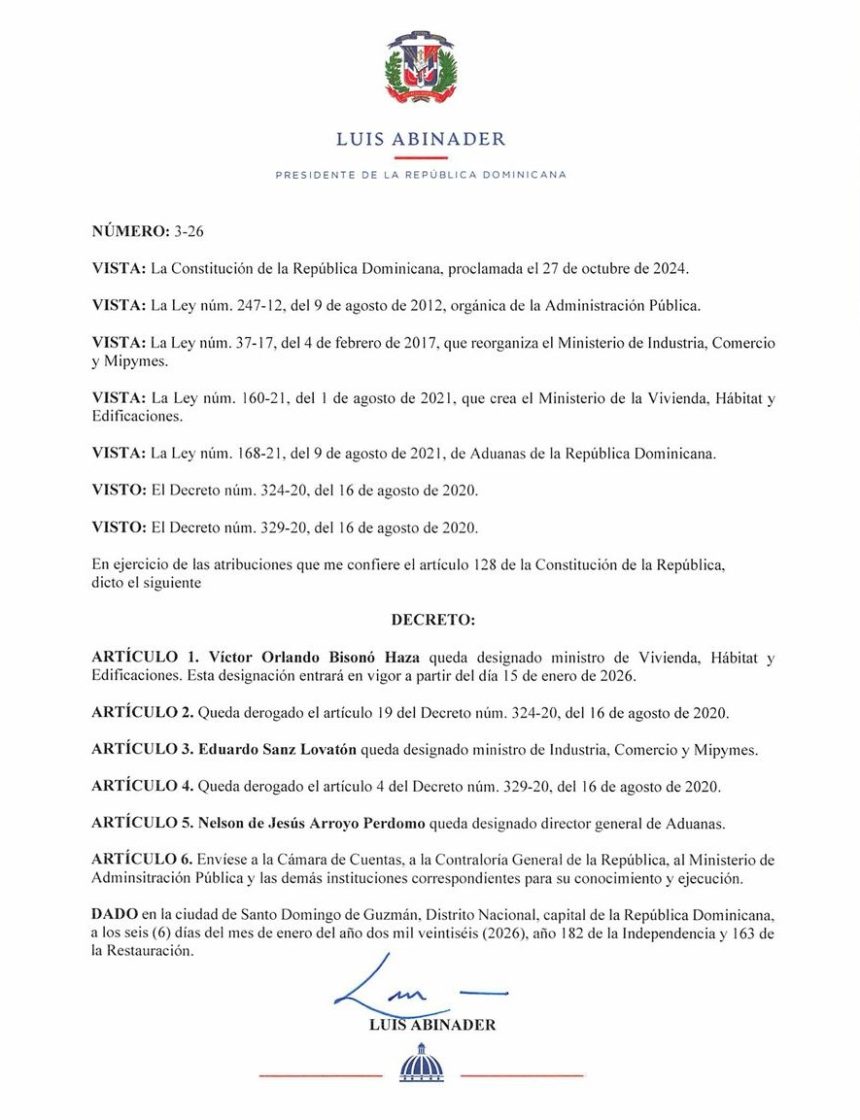 La disposición presidencial establece que Víctor Orlando Bisonó Haza, quien se desempeñaba como ministro de Industria, Comercio y Mipymes, pasa ahora a dirigir el Ministerio de Vivienda, Hábitat y Edificaciones (MIVHED). Bisonó asume el reto de dar continuidad a los proyectos habitacionales y de infraestructura que ejecuta el Poder Ejecutivo a nivel nacional.