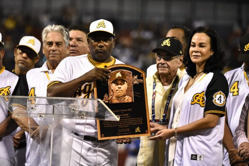 SANTIAGO.– Las Águilas Cibaeñas rindieron a Miguel Tejada el más grande honor al retirar el número 4 que utilizó durante 17 temporadas con el equipo.