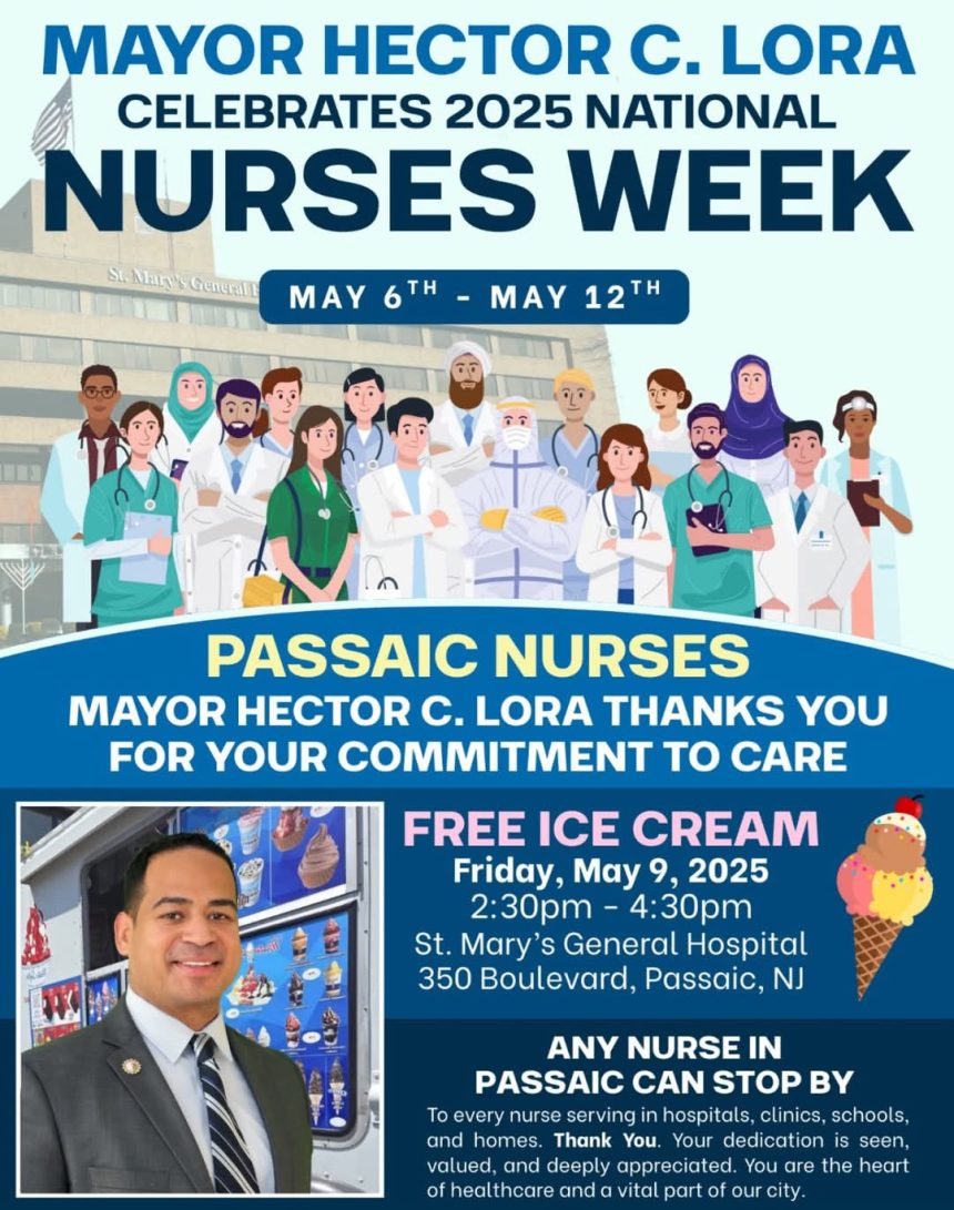 > “Hoy celebramos la Semana de la Enfermería en nuestra ciudad de Passaic y nos preparamos para la Semana Nacional del Hospital, patrocinando helado gratis para todos en el Hospital General St. Mary’s. Nos unimos al personal para agradecer a todos los trabajadores de la salud en todas partes. Su dedicación es vista, valorada y profundamente apreciada. Ustedes son el corazón del cuidado de salud y una parte vital de nuestra ciudad”, declaró el alcalde Lora.