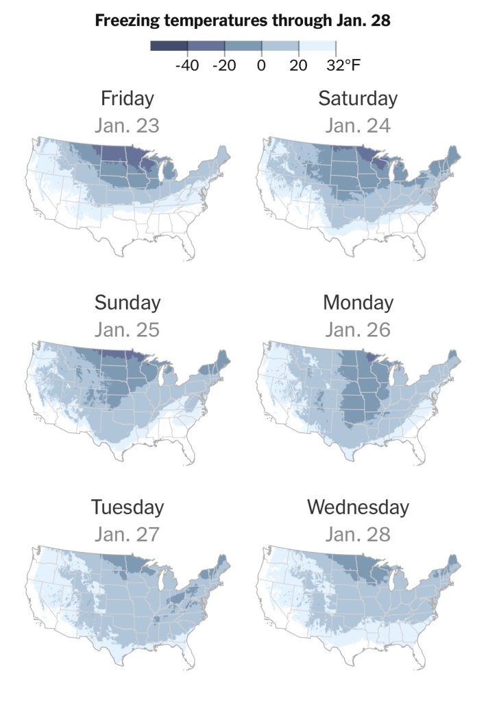 Las temperaturas serán particularmente bajas. El sábado, Nueva York difícilmente alcanzará los –6 °C, con máximas previstas entre –7 y –8 °C. El domingo será apenas más templado, con temperaturas máximas en torno a los –4 °C.