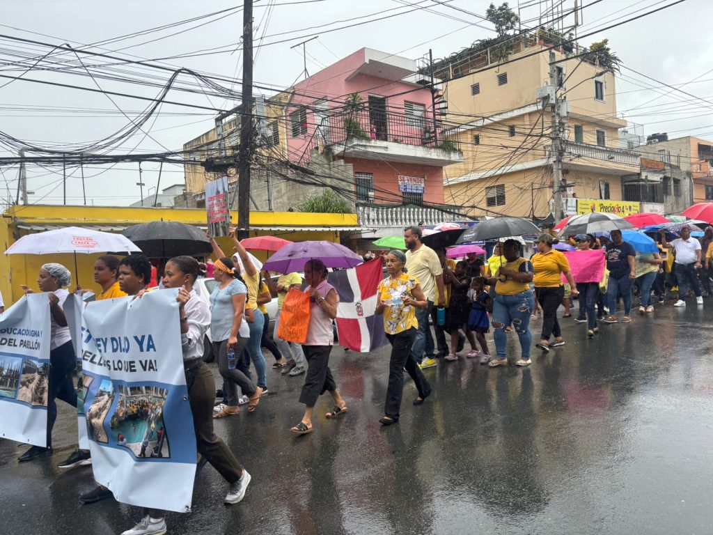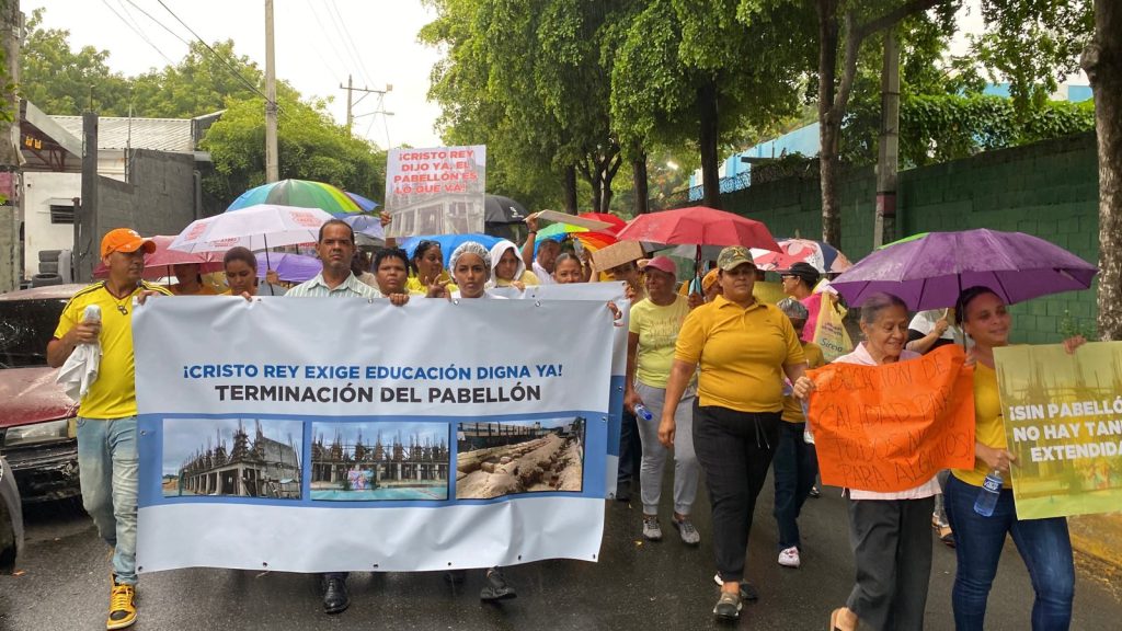 Santo Domingo.- Bajo lluvias y con las consignas “¡Cristo Rey dijo ya, el pabellón es lo que va!”, y “¡No más promesas, queremos la terminación de la escuela!”, decenas de personas pertenecientes a la Asociación de Padres, Madres, y Tutores (Apmae), del Centro Educativo Parroquial Cristo Rey, ubicado en la Prolongación Tiradentes, marcharon por varias calles y avenidas de la popular barriada, para exigir a las autoridades del Ministerio de Educación y la Dirección de Infraestructuras, la terminación de la construcción del pabellón de la secundaria de dicha escuela.