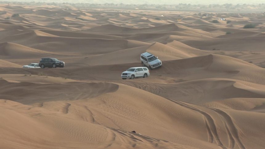 Después de eso, todos los turistas subimos a las camionetas 4×4. Los conductores pasaron uno a uno por un acceso vigilado, que funciona como la entrada oficial al desierto. En ese momento, ya estábamos oficialmente dentro del desierto de Dubái.
