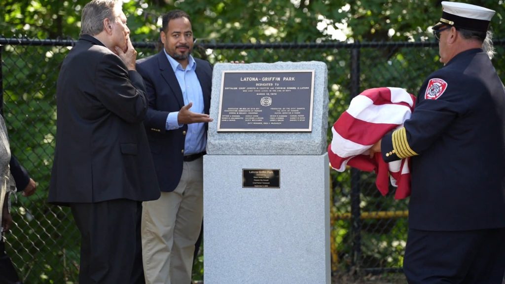 Durante la ceremonia se rindió homenaje al Jefe de Batallón Joseph Griffin y al Bombero Sam Latona, quienes en 1970 perdieron la vida en un trágico incendio en un edificio de la calle Third, tras el colapso de la estructura. Griffin contaba con 20 años de servicio, mientras que Latona, de solo 24 años, tenía menos de un año en la brigada. Desde entonces, el monumento ha permanecido como símbolo de valentía y entrega por casi cinco décadas.