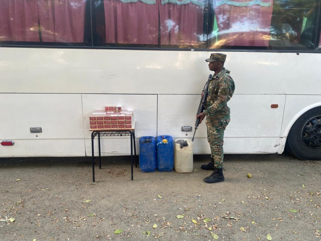 Valverde .-Un autobús del transporte público fue detenido por miembros del Ejército de República Dominicana, en el cual fueron encontradas bebidas alcohólicas y energizantes, cigarrillos de contrabando e inmigrantes haitianos indocumentados.