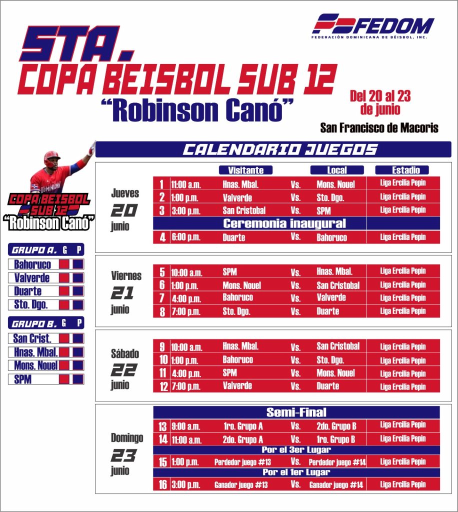 Santo Domingo, D.N.- El encuentro entre las provincias de las Hermanas Mirabal y Monseñor Nouel a las 11:00 de la mañana del jueves 20 de junio marcará el inicio del calendario de competencias de la quinta edición del Campeonato Nacional U12 Robinson Canó, que por segundo año va a San Francisco de Macorís.