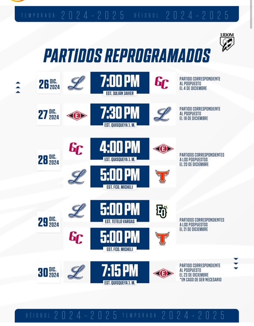 de siete partidos yanunció la reprogramación de varios juegos pospuestos o suspendidos por lluvia a partir de este próximo 26 de diciembre.