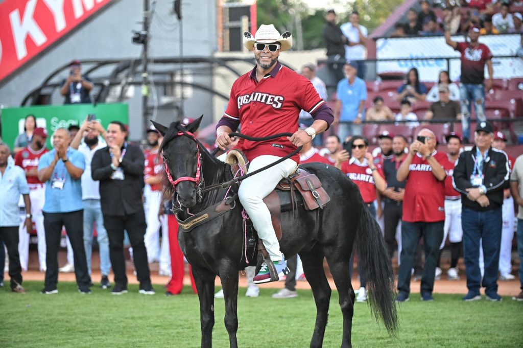 SAN FRANCISCO DE MACORIS. –Nelson Cruz entró galopando a caballo junto a Moisés Sierra y Joel Peralta al terreno del Estadio Julián Javier en la ceremonia de retiró de su camiseta número 18 en la organización de Gigantes del Cibao.