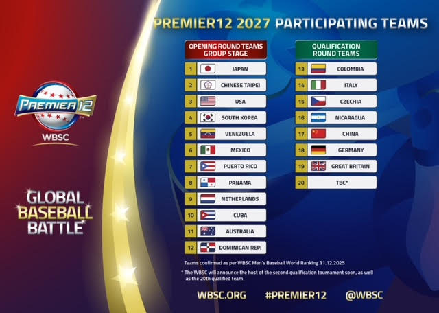 LAUSANA, Suiza – La Confederación Mundial de Béisbol y Softbol (WBSC) anunció 19 de los 20 programas de béisbol masculino que participarán en el Premier12 WBSC™ 2027. En su cuarta edición, el Premier12™ WBSC 2027. En su cuarta edición, el Premier12 WBSC contará con un nuevo formato con los 12 mejores equipos del Ranking Mundial de Béisbol Masculino WBSC (al 31 de diciembre de 2025) acompañados por cuatro equipos de dos torneos de clasificación que se jugarán en 2026.