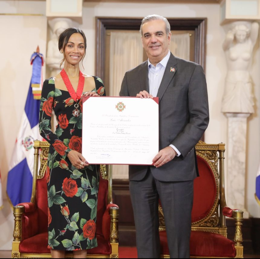 Santo Domingo.- El presidente Luis Abinader junto a la vicepresidenta Raquel Peña y la primera dama Raquel Arbaje, condecoró este miércoles a la destacada actriz dominicana Zoe Saldaña con la Orden Heráldica de Cristóbal Colón en el Grado de Comendador, en reconocimiento a su exitosa trayectoria en la industria cinematográfica y su contribución a la proyección internacional de la cultura dominicana.