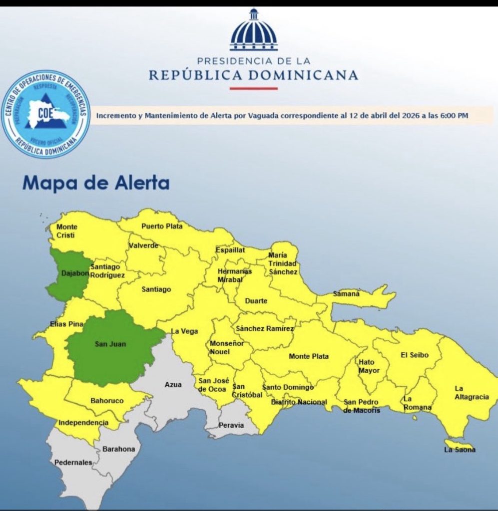 De su lado, el director del Centro de Operaciones de Emergencias (COE), Juan Manuel Méndez, ratificó el nivel de alerta amarilla para las provincias de Puerto Plata, Espaillat, María Trinidad Sánchez, Valverde, Santiago, Independencia, San Pedro de Macorís, Monseñor Nouel, Sánchez Ramírez, Monte Plata, La Vega, Monte Cristi, Elías Piña, La Altagracia, San José de Ocoa, San Cristóbal, Santo Domingo, Distrito Nacional, Bahoruco, Duarte (en especial el Bajo Yuna), La Romana, Santiago Rodríguez, Hato Mayor, El Seibo, Hermanas Mirabal y Samaná. En tanto, que se mantienen en alerta verde las provincias de San Juan y Dajabón.