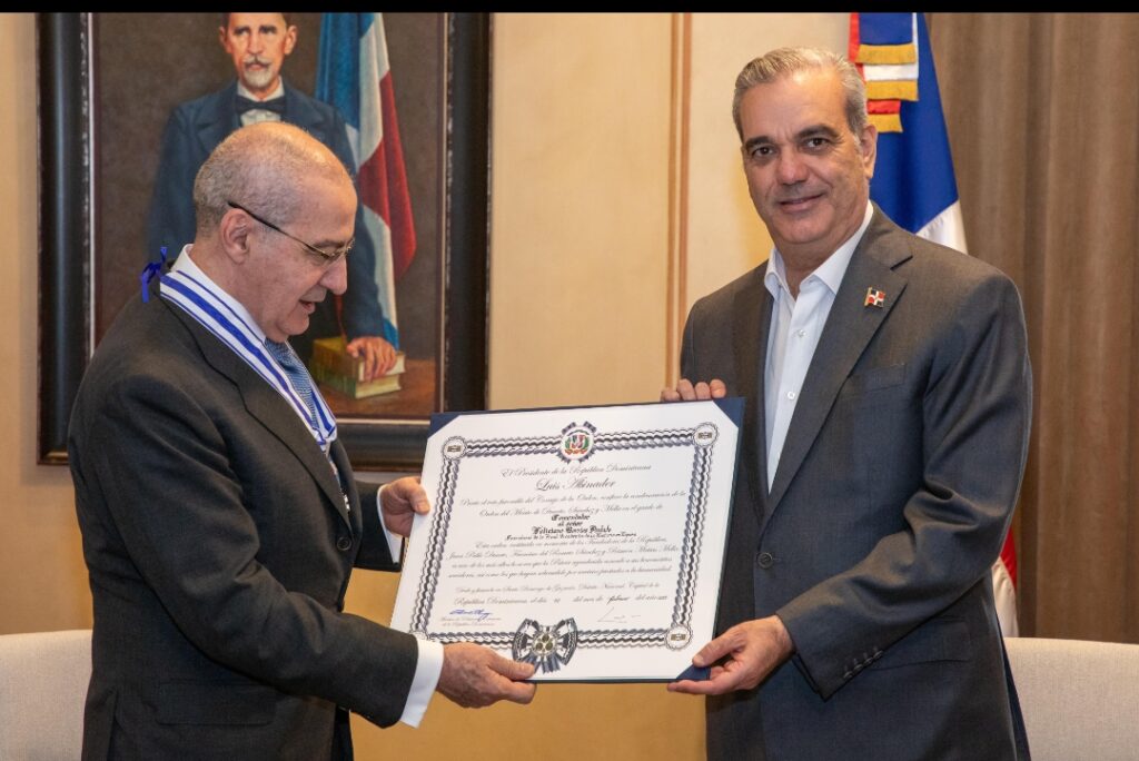 Santo Domingo. – El presidente Luis Abinader impuso la Orden al Mérito de Duarte, Sánchez y Mella en el grado de Comendador al académico español, Dr. Feliciano Barrios Pintado, uno de los más importantes historiadores españoles.