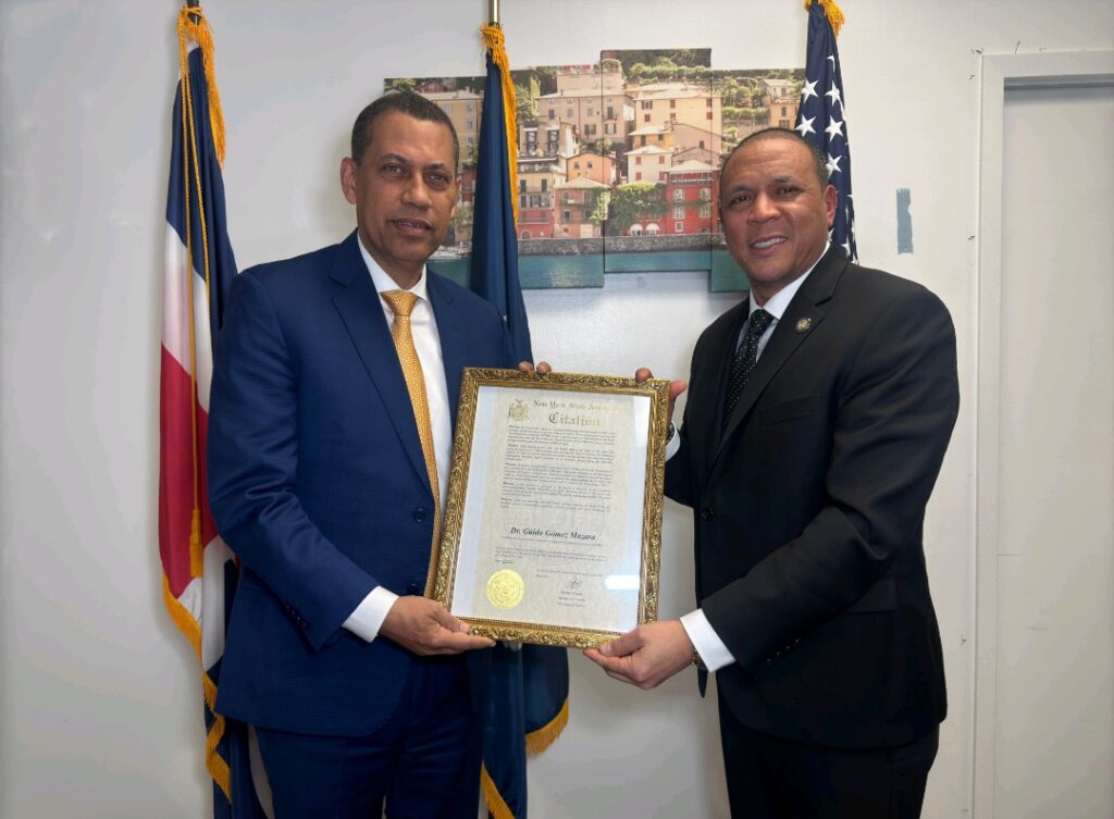 Nueva York, EE. UU. – El presidente del Consejo Directivo del Instituto Dominicano de las Telecomunicaciones (INDOTEL), Guido Gómez Mazara, fue reconocido en la ciudad de Nueva York por su destacada labor en la modernización del sector de telecomunicaciones en República Dominicana.La distinción fue otorgada por el legislador de Nueva York de origen dominicano, George Álvarez, quien representa al Distrito 78 de la referida ciudad, que tiene una población de aproximadamente 142 mil habitantes.Este reconocimiento refuerza la proyección internacional de la gestión de INDOTEL y su compromiso con la modernización del sector, cuya institución, liderada por Gómez Mazara, ha impulsado importantes avances en materia de regulación, infraestructura digital y expansión del acceso a internet, consolidando a República Dominicana como un referente en el desarrollo tecnológico en la región.Durante el acto de entrega, Álvarez destacó la visión y el liderazgo de Gómez Mazara en la implementación de políticas que han fortalecido la conectividad y el acceso a las tecnologías de la información en el país. “Este reconocimiento es un testimonio del impacto que su gestión está teniendo en la reducción de la brecha digital y en la promoción de la inclusión tecnológica en República Dominicana”, expresó Álvarez.Al recibir la distinción, Guido Gómez Mazara expresó su agradecimiento y reafirmó el compromiso del INDOTEL con la transformación digital del país, y dijo que este reconocimiento los motiva a seguir impulsando políticas públicas que fortalezcan el acceso equitativo a las telecomunicaciones, promoviendo el desarrollo, la innovación y la inclusión digital en toda la nación.»Nuestro objetivo es colocar la tecnología al servicio de la ciudadanía, asegurando que cada dominicano tenga las herramientas para integrarse a la sociedad digital”, destacó el presidente del INDOTEL», enfatizó el titular de órgano regulador de las telecomunicaciones.