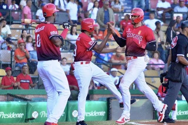 Los dueños de casa llenaron las bases sin outs en el sexto ante Anderson Severino, quien fue sustituido por Jhan Maríñez, que caminó a Jorge Mateo para que los escogidistas empataran 2-2. Un imparable de Michael De la Cruz al prado izquierdo empujó otras dos para los rojos, que sumaron una más con un passed ball de Tres Barrera que llevó a De la Cruz a la antesala desde anotó por indiscutible de Alcides Escobar al central. Un incogible de Erik González al central movió a Escobar a tercera para alcanzar la registradora con otro passed ball de Barrera.