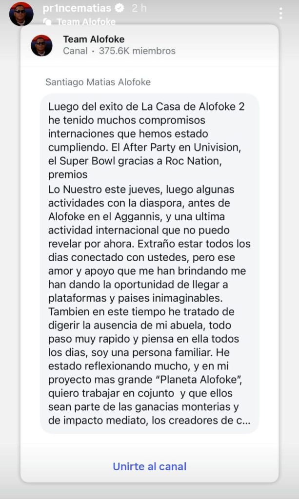 El empresario y productor Santiago Matías compartió públicamente a través de sus redes sociales que se encuentra reflexionando sobre el futuro de su proyecto Planeta Alofoke, contemplando la posibilidad de desarrollar un modelo más colaborativo que integre a creadores de contenido en los beneficios económicos y el impacto mediático de la plataforma.