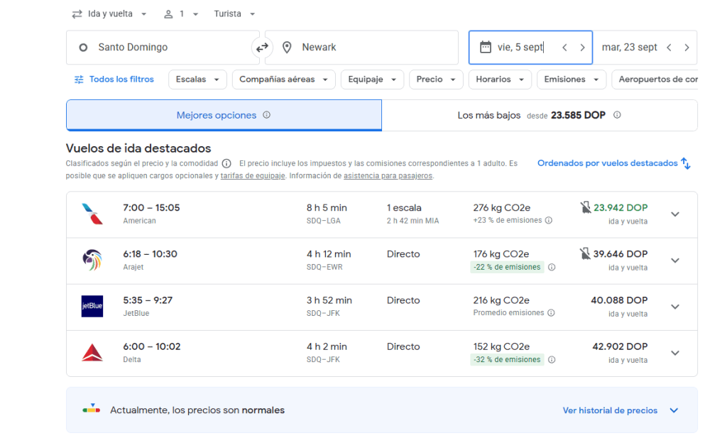 • American Airlines vende pasajes en RD$ 24,600, aunque con escala, ya que no opera vuelos directos hacia Nueva York desde República Dominicana.
