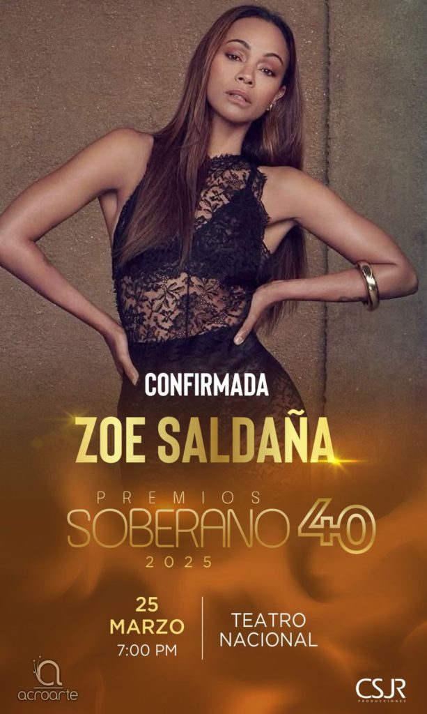 Santo Domingo, R.D.– La talentosa actriz estadounidense de origen dominicano, Zoe Saldaña, confirmó este domingo su participación en Premios Soberanos, y será una de las grandes estrellas invitadas en la noche de celebración del 40 aniversario